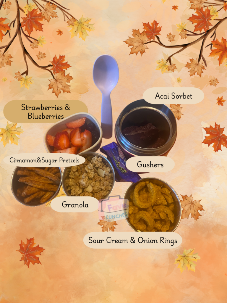 Pack an acai or smoothie bowl for lunch with all the toppings. This lunch is a great way to increase the amount of your child’s daily fruit intake. I used a sorbet based acai in the above picture but a thick smoothie can also be made instead. Having your child create their own acai bowl masterpiece is an exciting way to have them experiment with different textures and flavors and combining these toppings that is within their control.